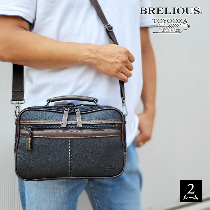 ショルダーバッグ カジュアルバッグ 日本製 豊岡製鞄 横 横型 2層 2WAY 牛革ハンドル 合皮 シボ加工 黒 メンズ 普段使い A5対応 BRELIOUS KBN16429