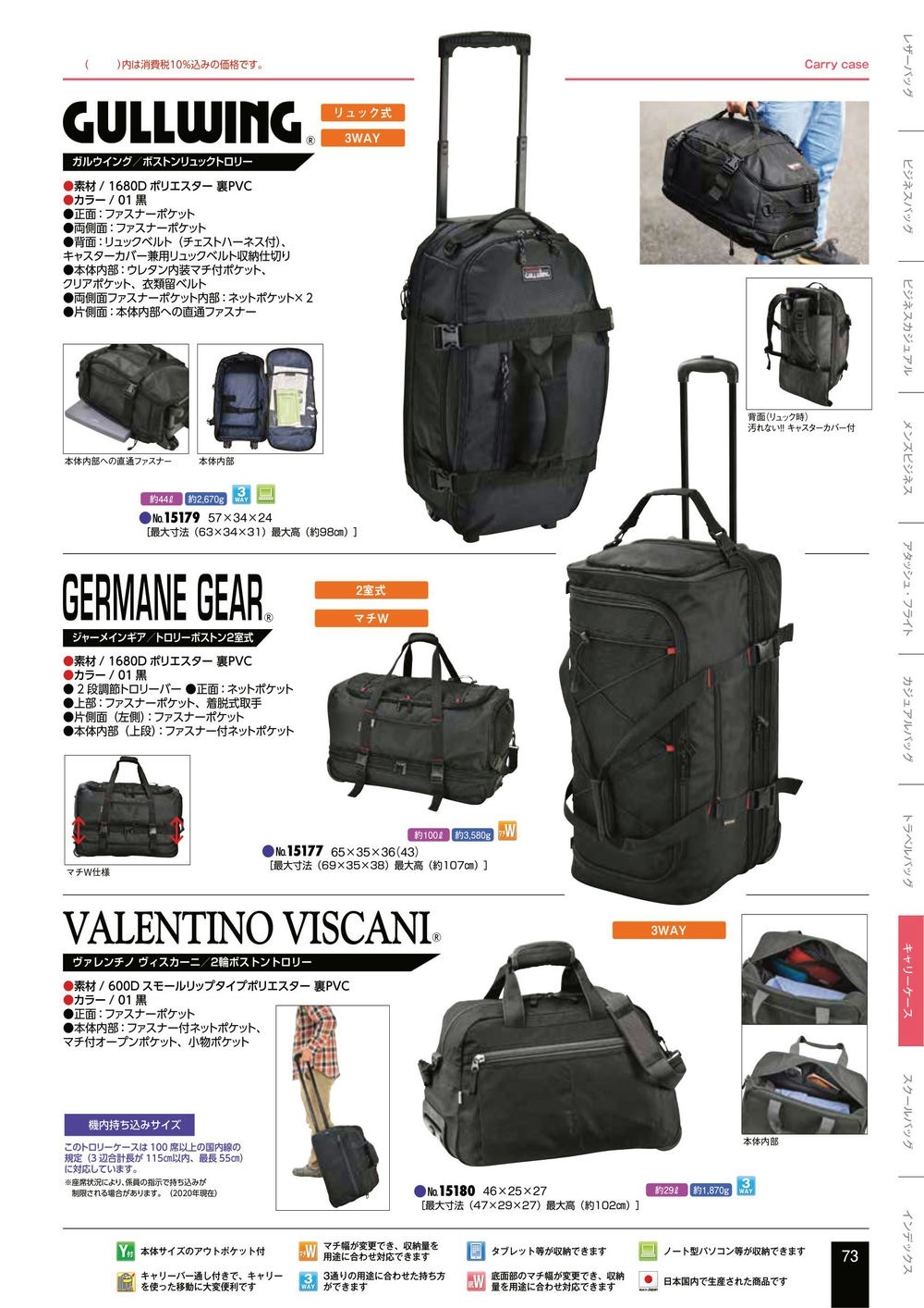 キャリーバッグ キャリーケース 大型 45L 4輪 軽量 丈夫 出張 旅行 メンズ レディース 黒 ブラック サイドハンドル PC収納 スーツケース トラベルバッグ Sサイズ GERMANE GEAR KBN15190