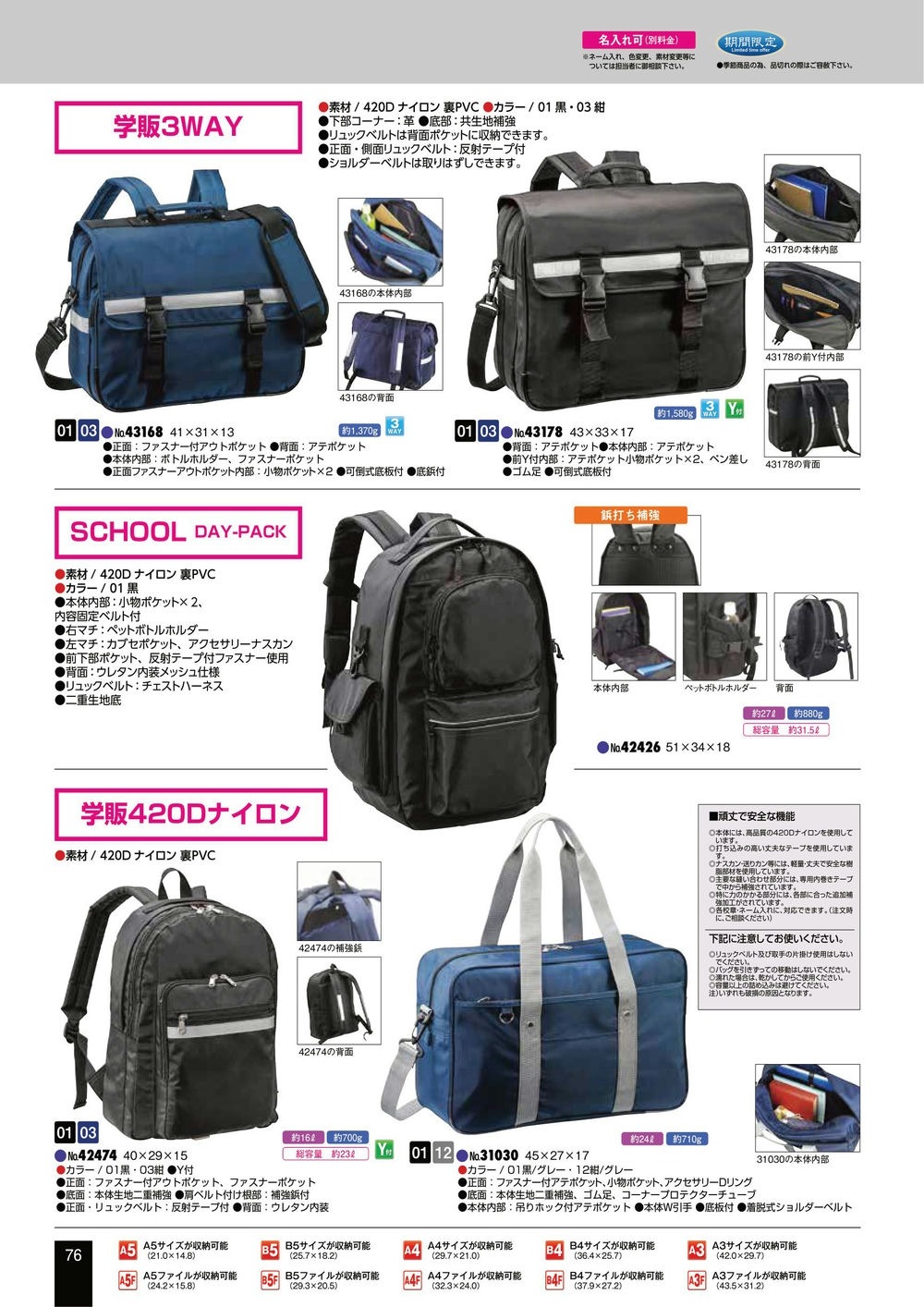 学販3WAYSCHOOL DAY-PACK学販420Dナイロン